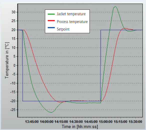 This case study demonstrates the ability of the CC-505 refrigeration bath circulator to cycle the process temperature in a range from +20°C to -50°C, the closeness of the temperature control and the minimum process temperature achievable in the process mass.