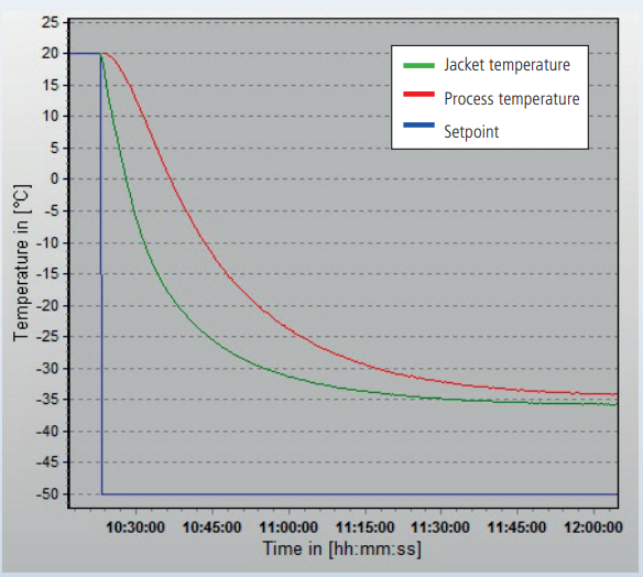 Once stable at +20°C under “Process“ control, a set-point of -50°C is entered. The CC-505 cools the reactor down to the minimum achievable process temperature of -34°C.