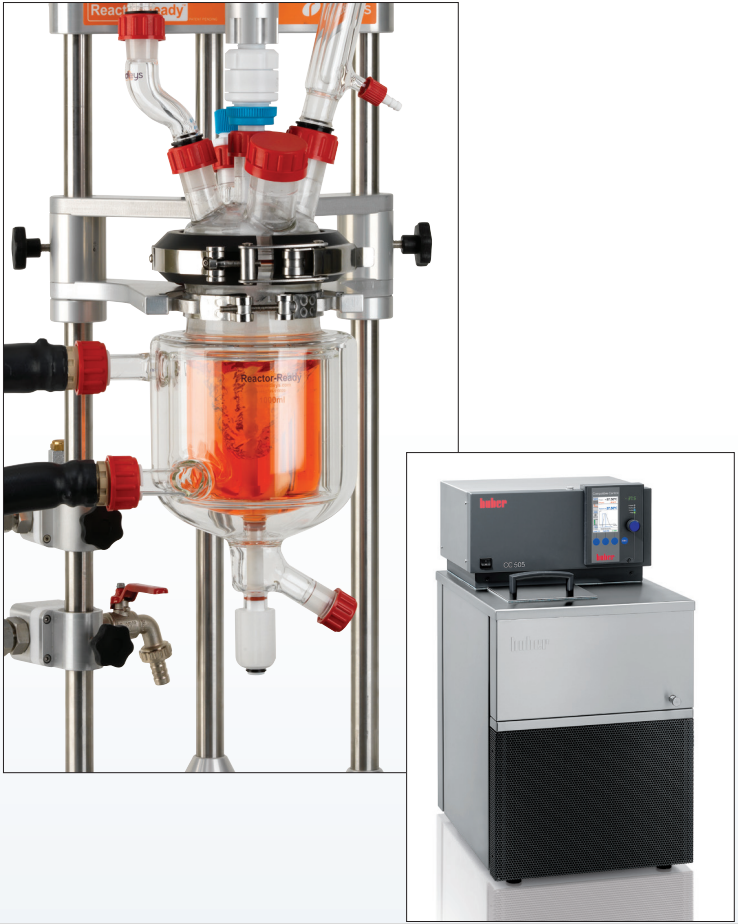 The 2 litre Radleys reactor was connected to the CC-505 using two M24x1.5 1-meter flexible hoses. The thermofluid used in the system was M40.165.10. “Process” control was carried out via a Pt100 sensor located in the process mass. Stirrer speed was set to 200 rpm.